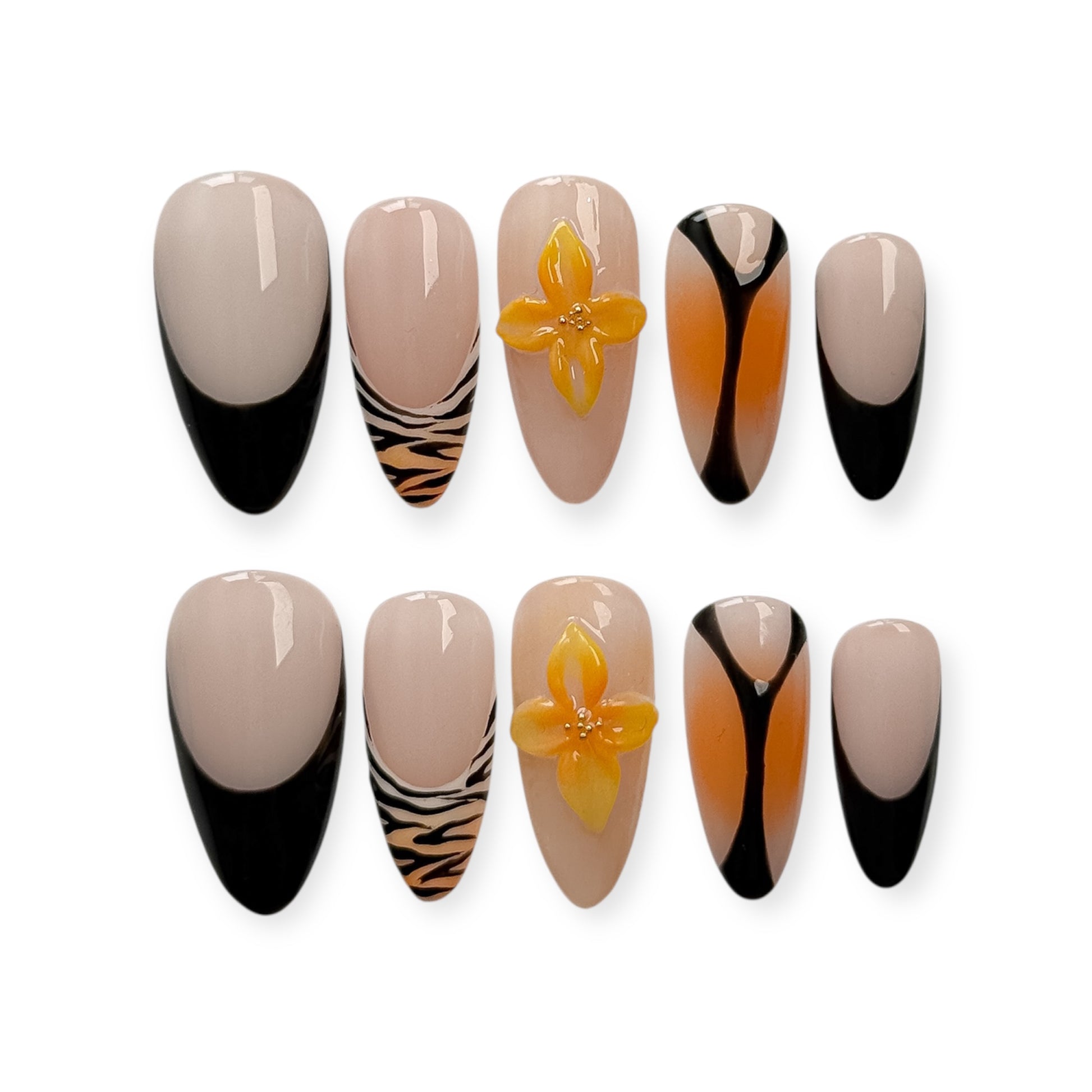 Laissez rugir votre style avec Tigre Fleurie, une fusion audacieuse entre le sauvage et le délicat. Ce set d’ongles prêts-à-poser combine des motifs zébrés inspirés de la jungle, des pointes noires élégantes, des dégradés orangés flamboyants et des fleurs 3D lumineuses pour un look résolument solaire et affirmé.