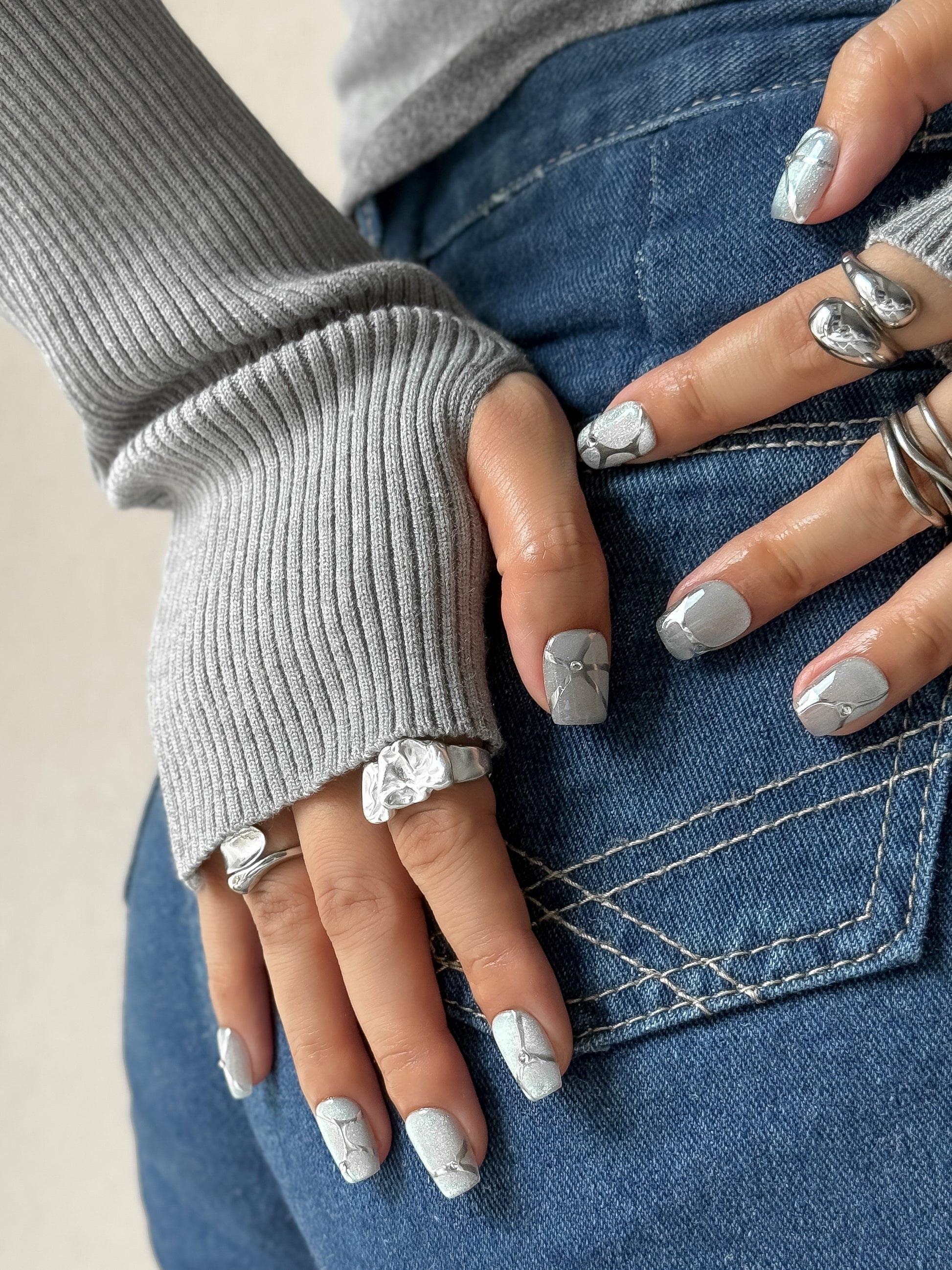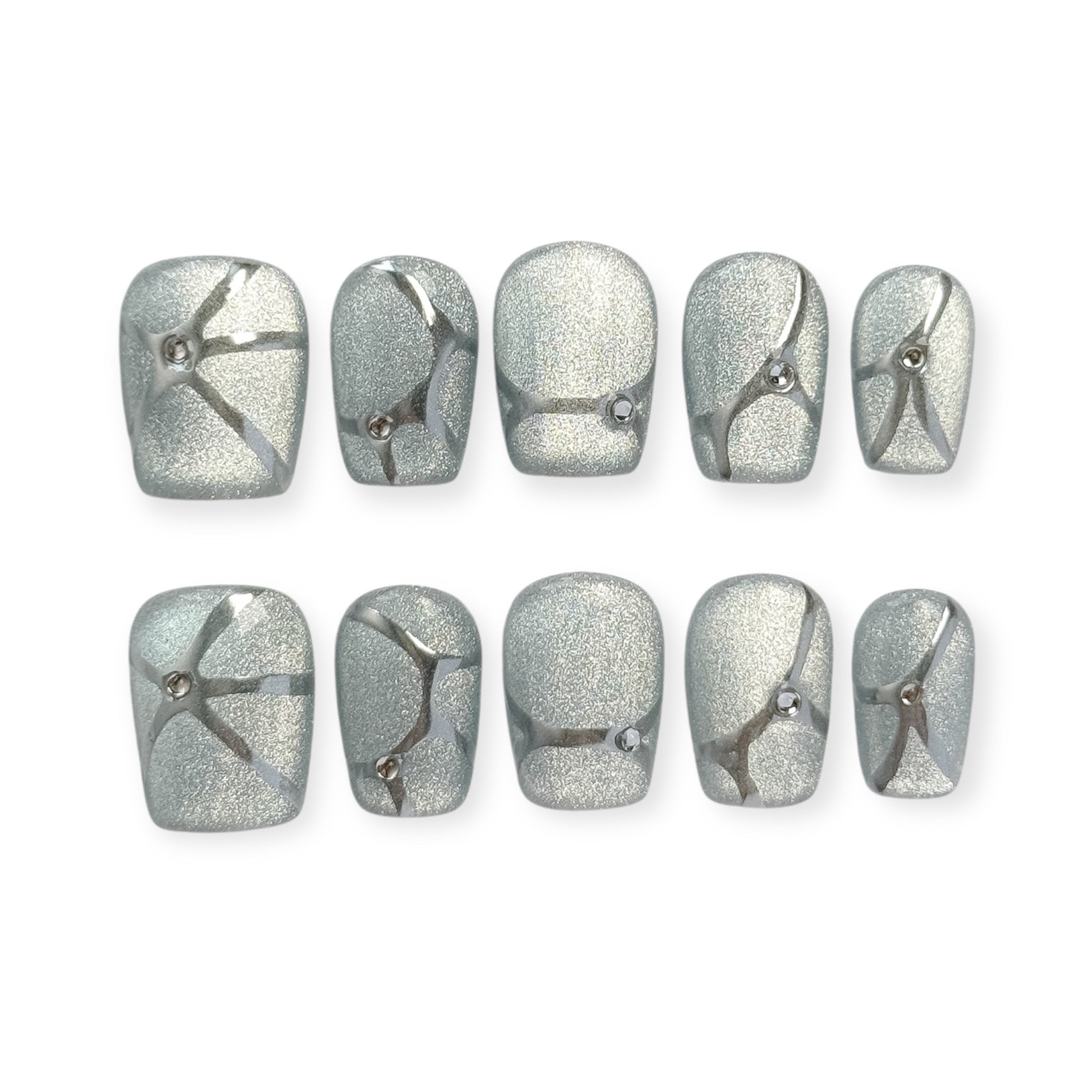 Adoptez un style futuriste avec Argenta, des ongles press-on argentés au design métallisé et fissuré inspiré du cyberpunk. Faciles à poser, longue tenue, et compatibles avec presque toutes vos tenues. Sublimez vos mains en quelques minutes.