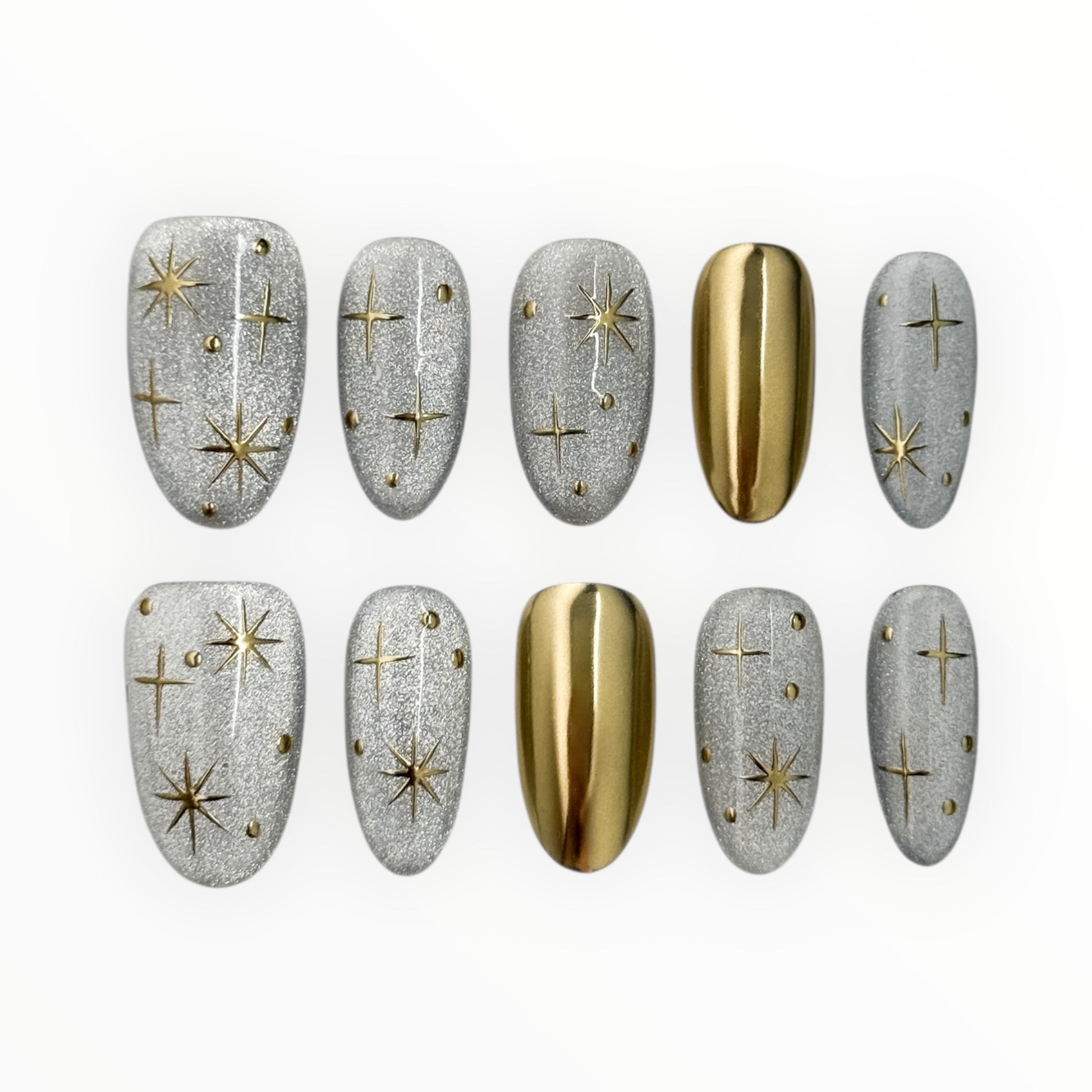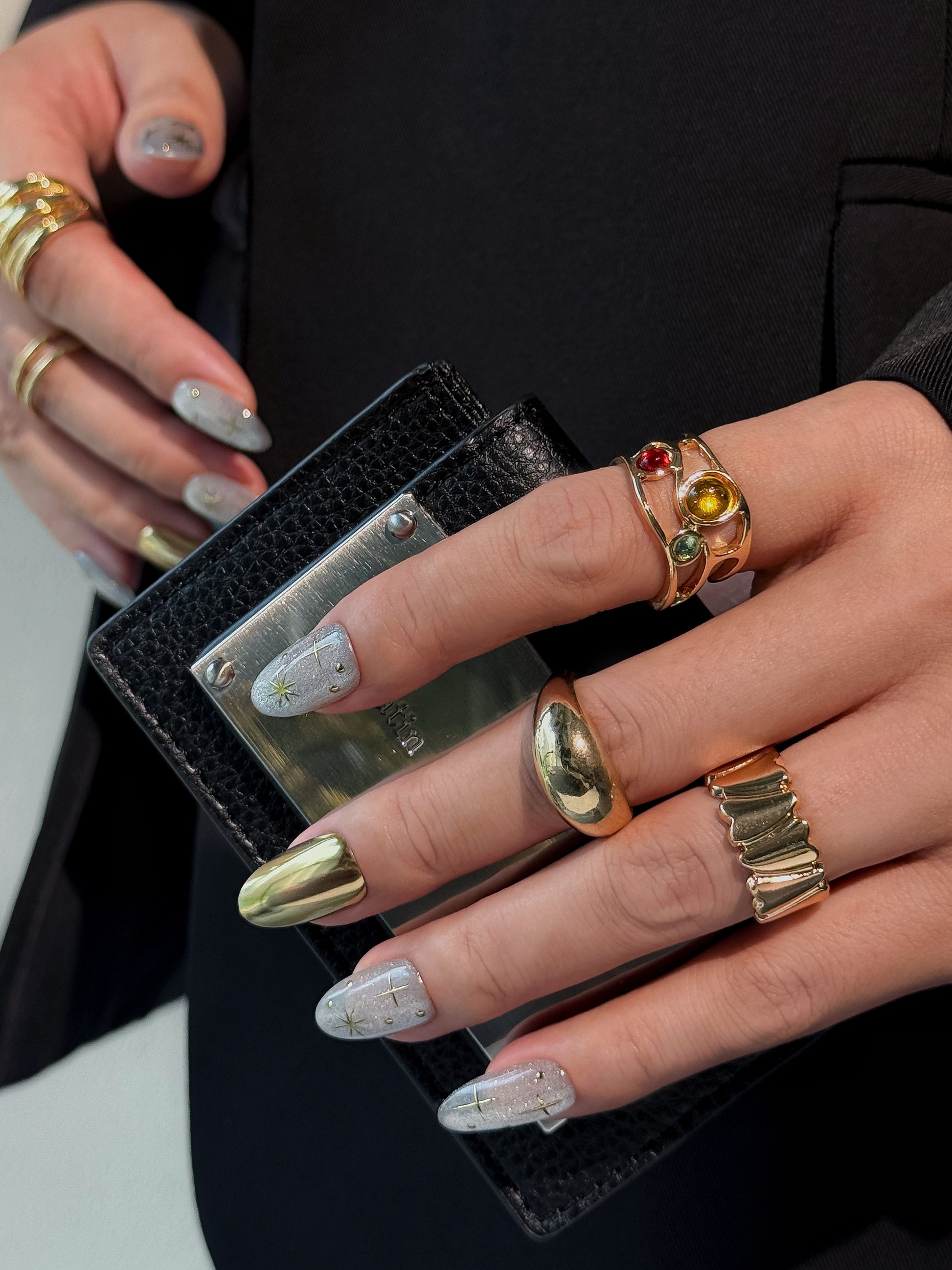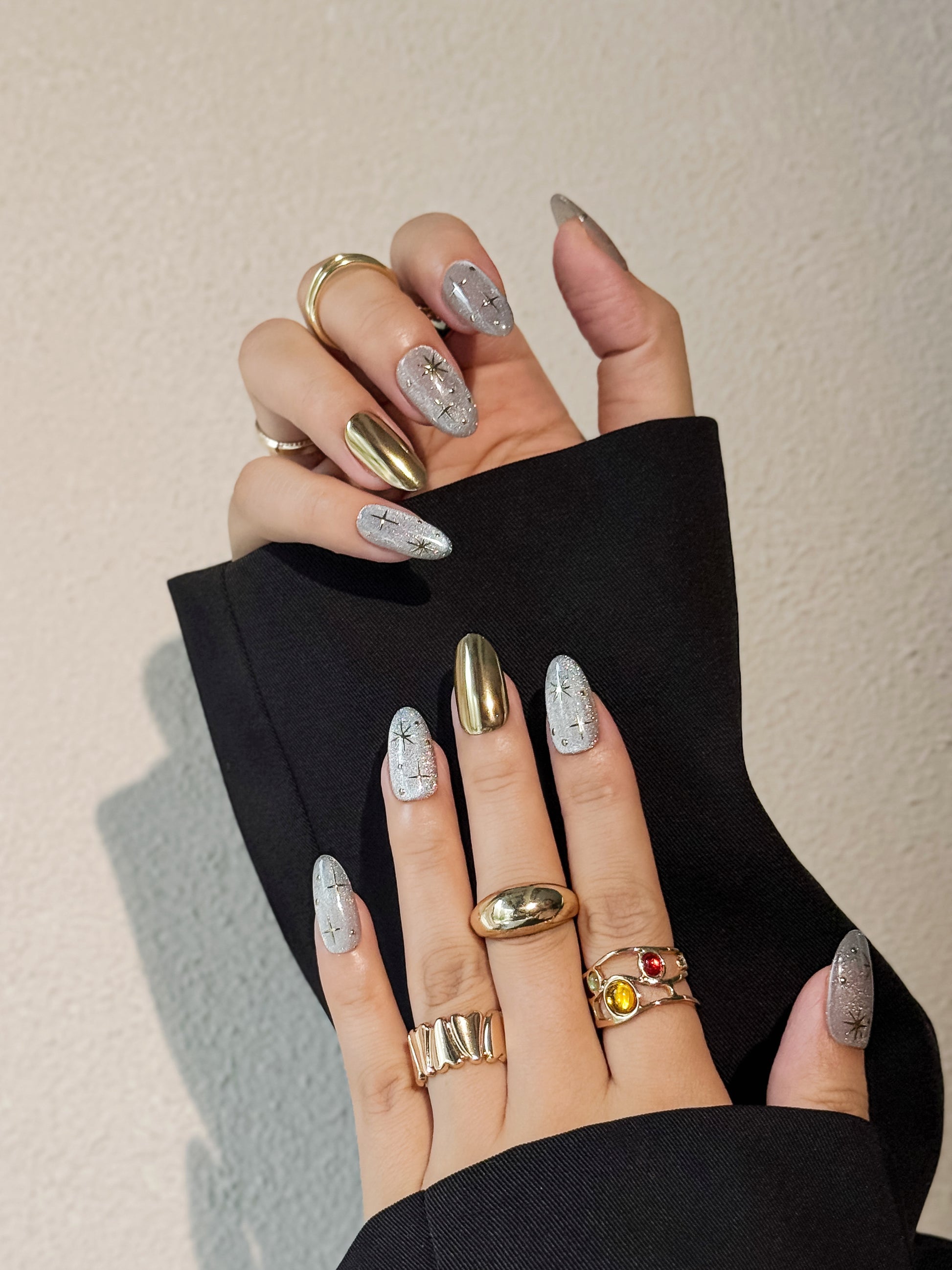 Cleora est bien plus qu’une simple manucure — c’est une déclaration d’élégance céleste. Inspirée par la lumière des étoiles et le luxe des métaux précieux, cette pose d’ongles allie l’éclat doré et argenté dans un design harmonieux et captivant.