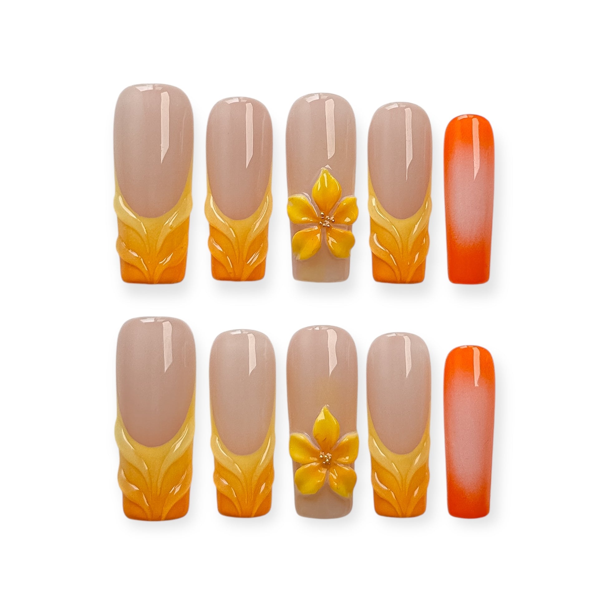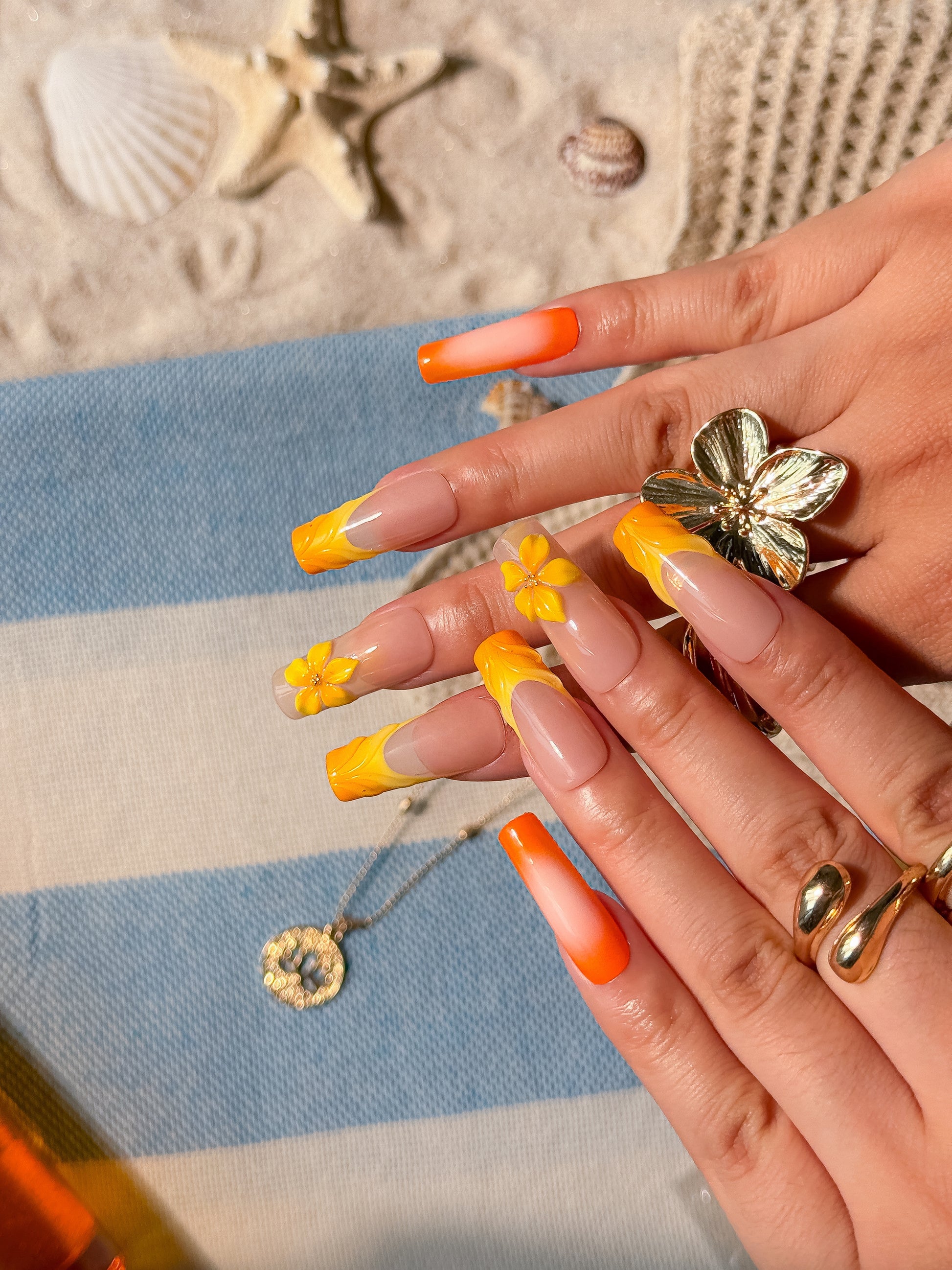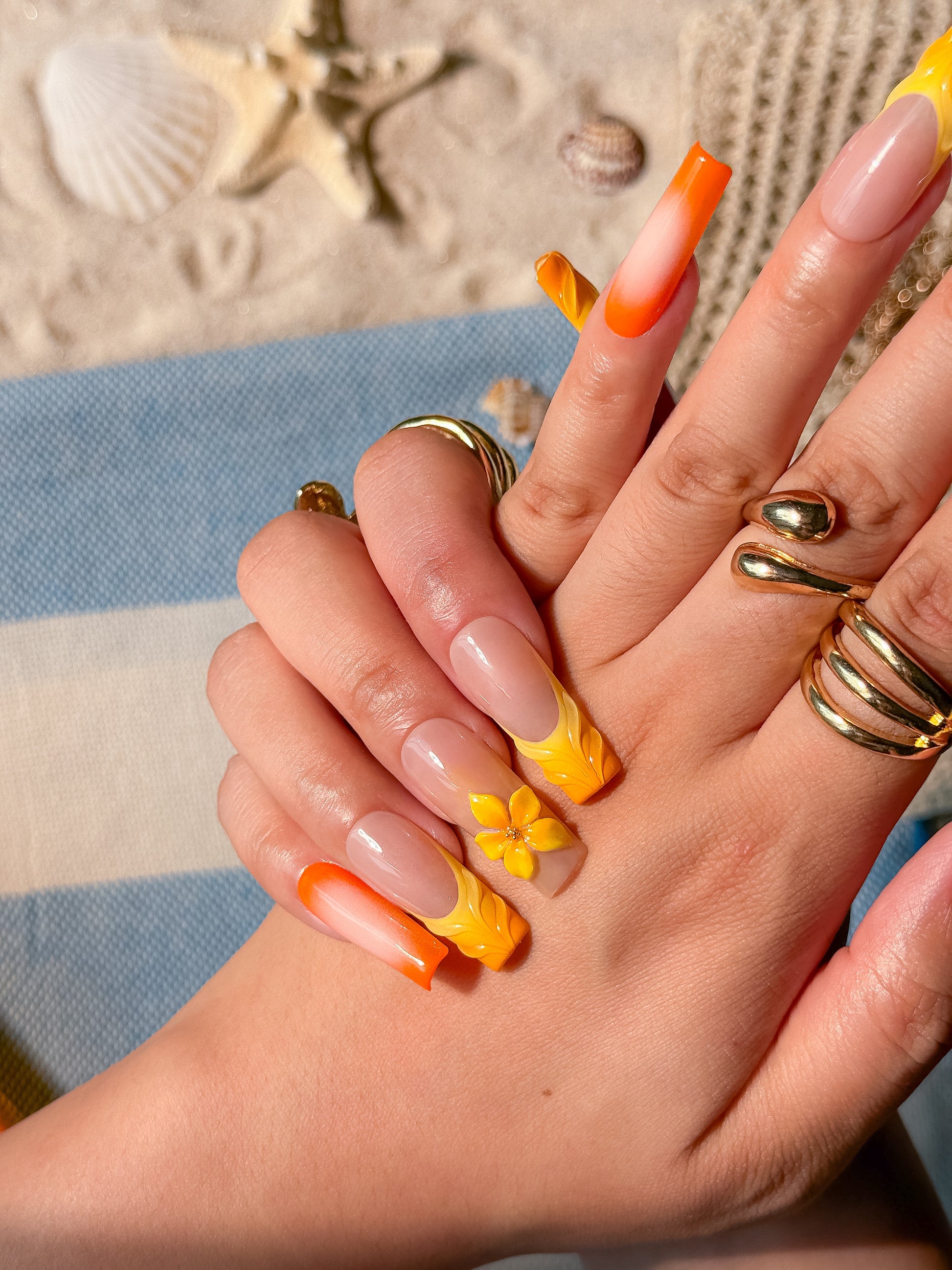 Plongez dans l’esprit des tropiques avec cette manucure éclatante et ensoleillée. Des dégradés d’orange vif et de jaune lumineux se mêlent à des motifs floraux 3D délicats, évoquant la chaleur, la joie et la liberté des vacances d’été. Chaque ongle capture l’énergie radieuse d’un coucher de soleil sur la plage, pour illuminer votre style et affirmer votre audace.