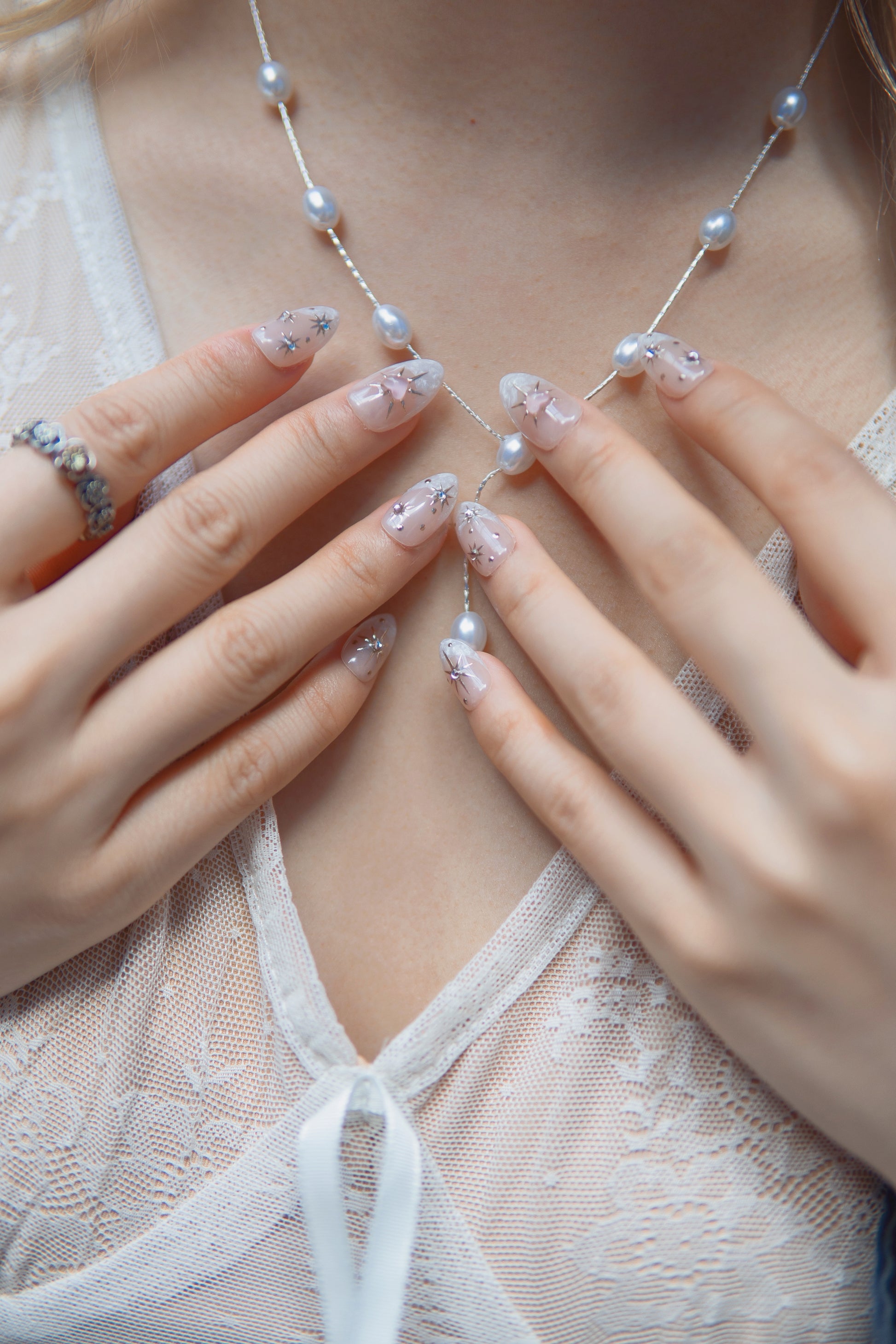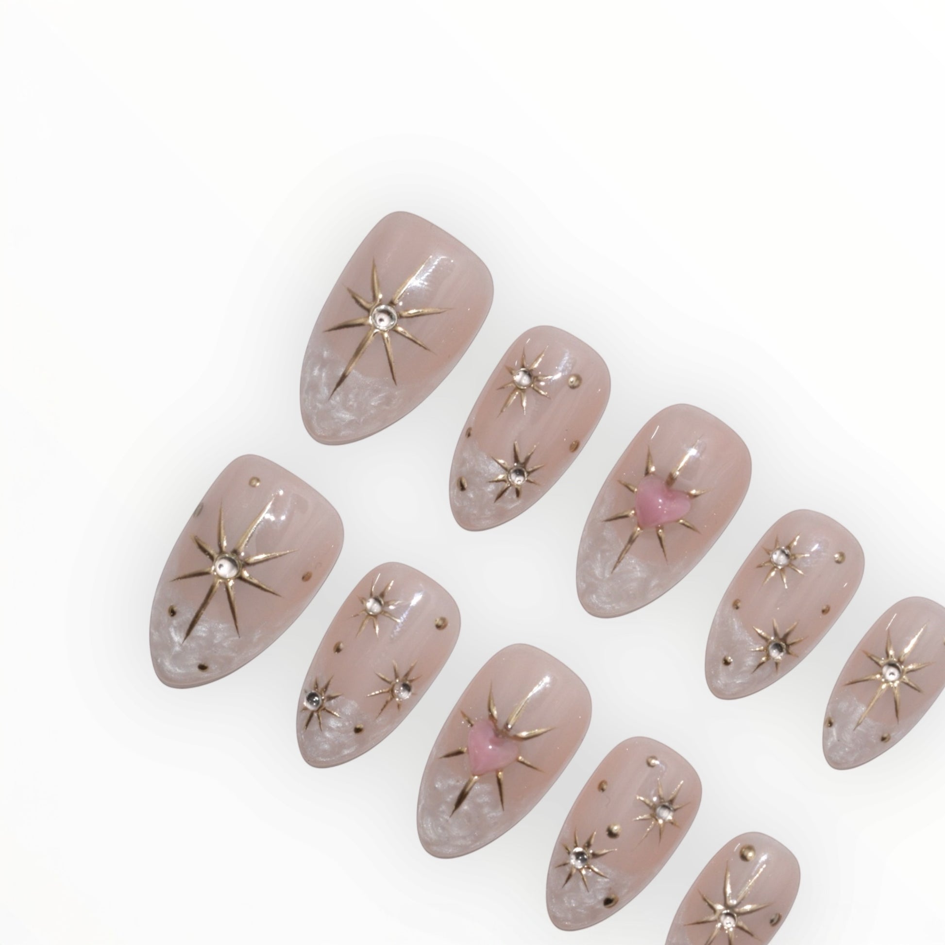 Inspiré par la douceur du ciel étoilé, ce design marie des étoiles dorées, des strass lumineux et de tendres cœurs roses sur une base nude délicatement marbrée. Un nude loin d’être banal, vibrant de détails subtils pour une manucure élégante et féerique. Faciles à appliquer et réutilisables, ces ongles press-on transforment vos mains en véritables œuvres d’art en quelques minutes.