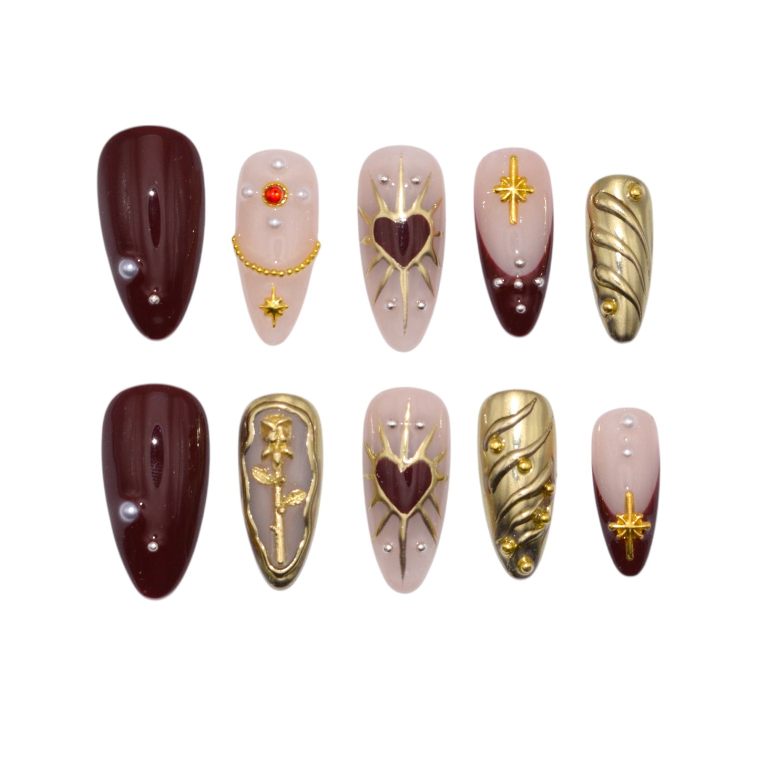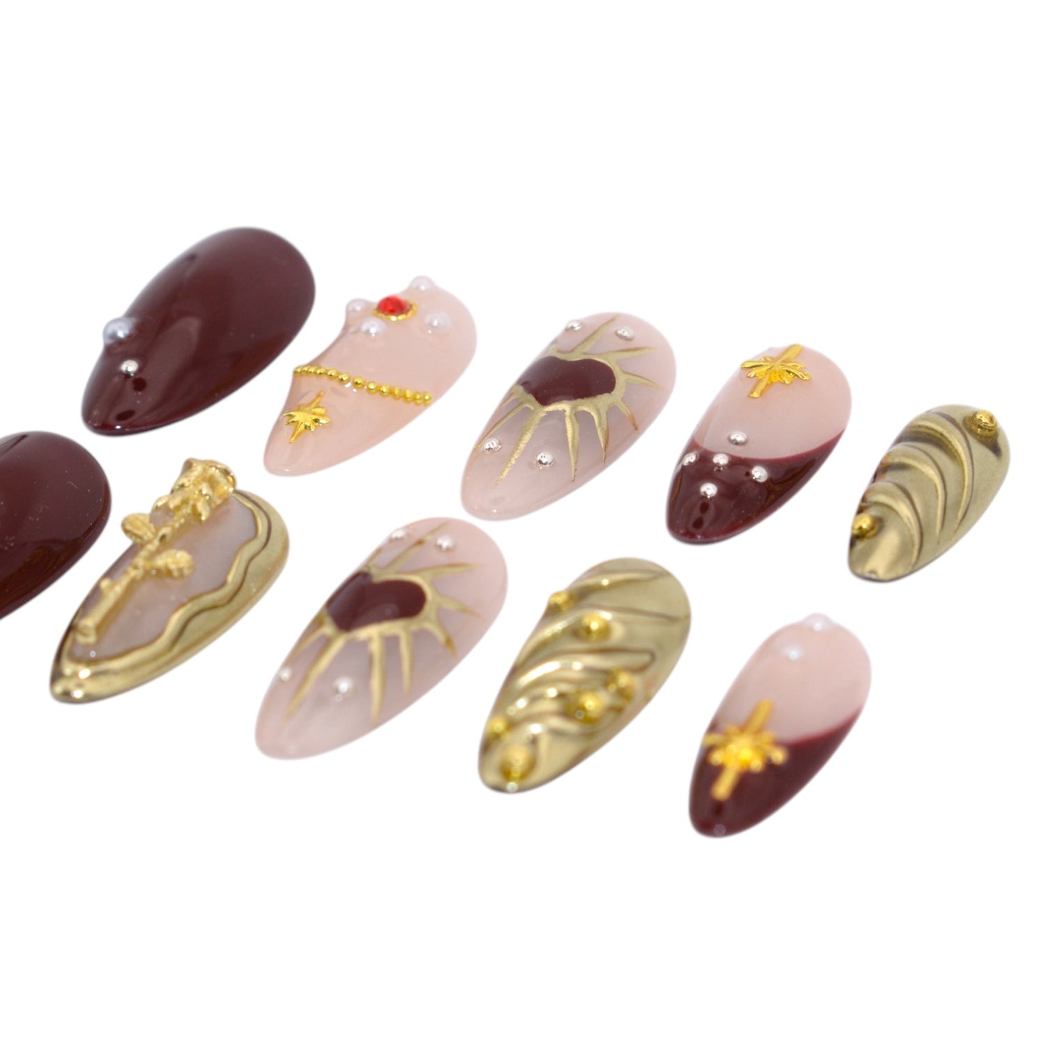 Inspiré par mes souvenirs d’un voyage envoûtant à Marrakech, cet ensemble d’ongles press-on mêle l’intensité du bordeaux profond, l’éclat du doré et la douceur d’une base nude sophistiquée.