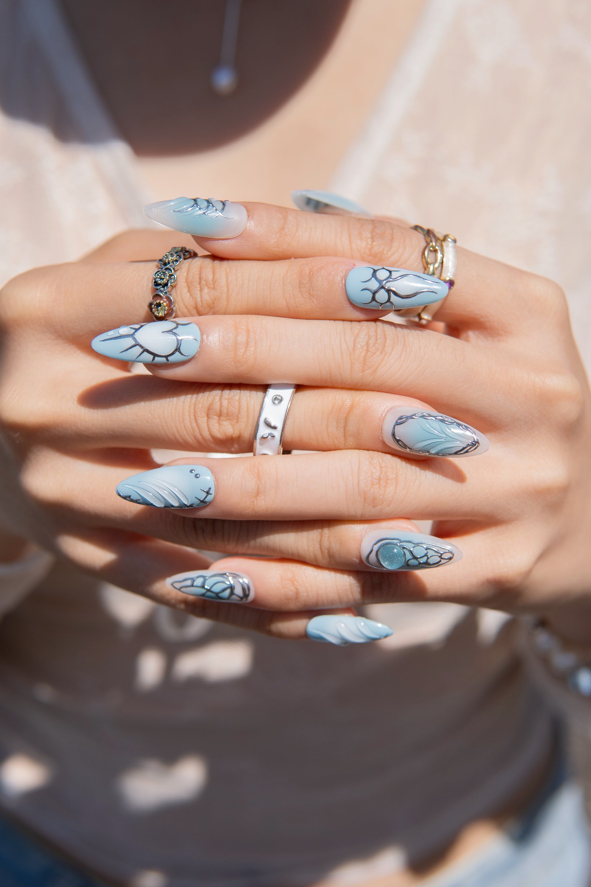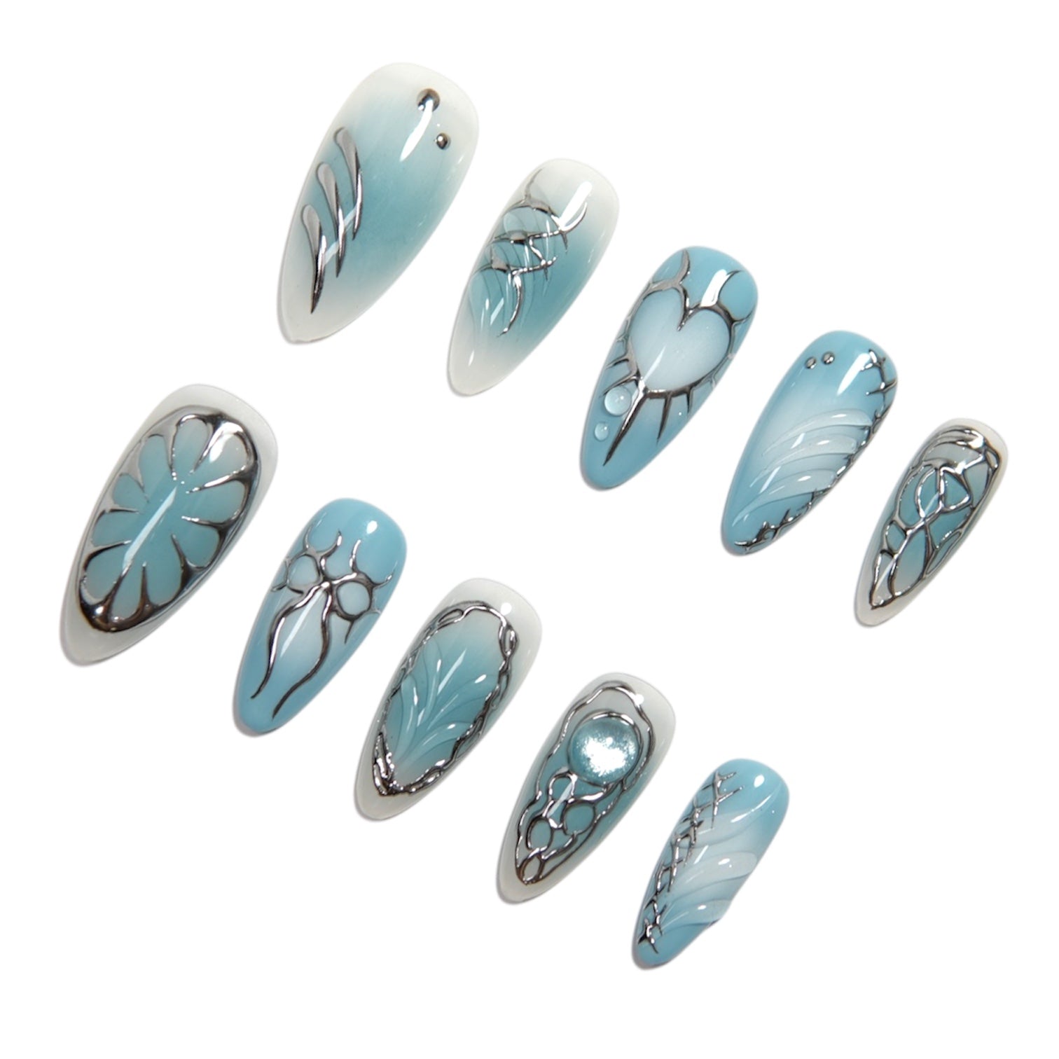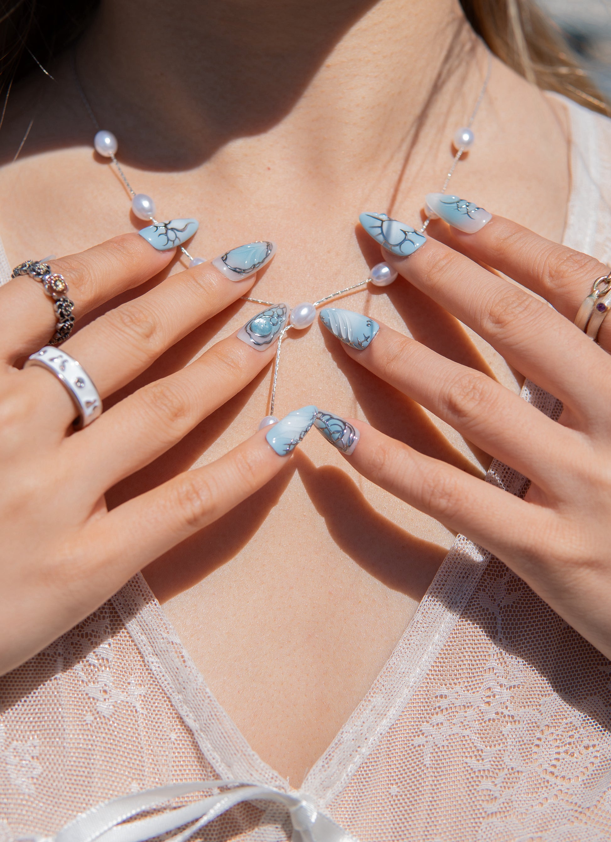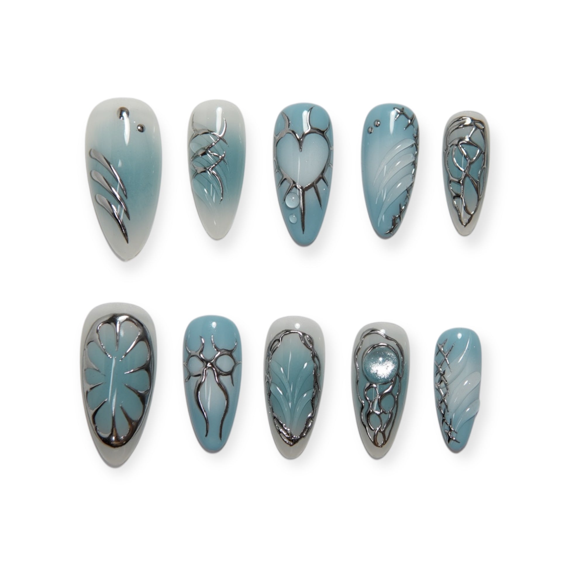 Système Bleuté est une manucure press-on inspirée de l’esthétique Y2K minimaliste. Ses tons bleu glacier s’harmonisent avec des lignes argentées pour un effet futuriste tout en subtilité. Faciles à appliquer et confortables à porter, ces faux ongles apportent une touche technopoétique à votre look.